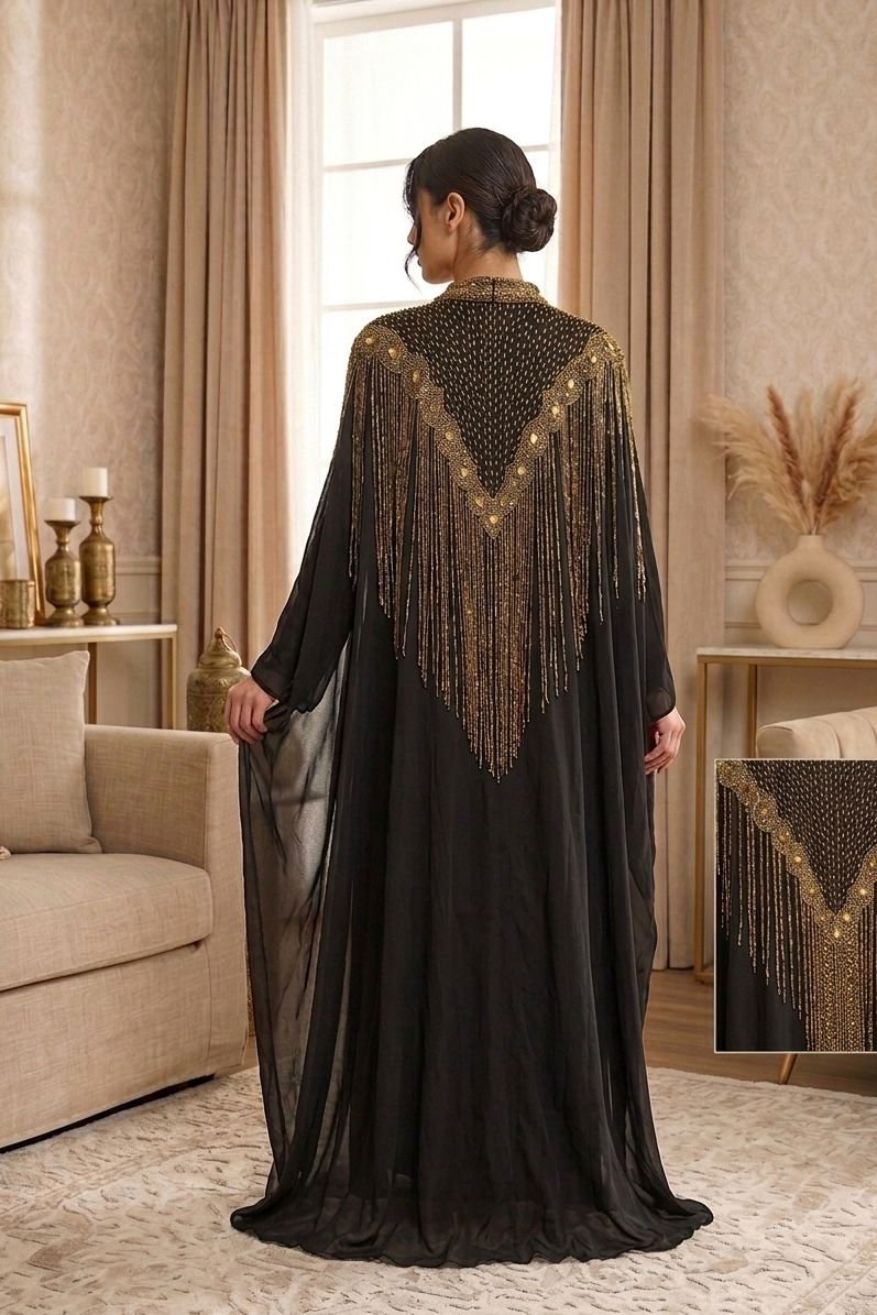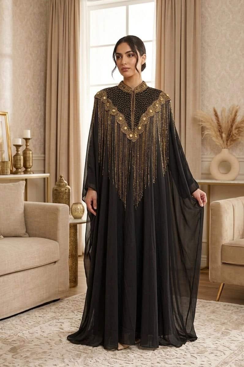 قطعة فريدة مصممة لتكون خيارك الأول للمناسبات الرسمية. تتميز بقصة البشت الواسعة مع “كول” مطرز بالكامل وسلاسل ذهبية طويلة تضفي لمسة من الفخامة والدراما على إطلالتكِ. تنفع كجلابية فخمة أو بشت سهرة فوق ملابسك.