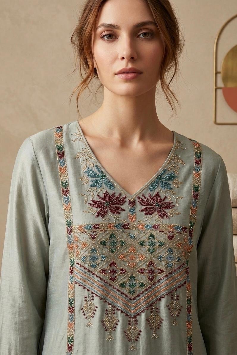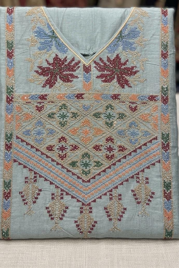 ما يميز هذه الجلابية حقاً هو التطريز الدقيق المستخدم بخيوط لامعة تضيف بريقاً ساحراً ومظهراً ملفتاً للنظر. الخيوط اللامعة ليست مجرد زينة، بل هي تعبير عن الحرفية العالية حيث تتداخل الألوان والنقوش لإبراز الطابع التراثي بطريقة حديثة ومبهرة.