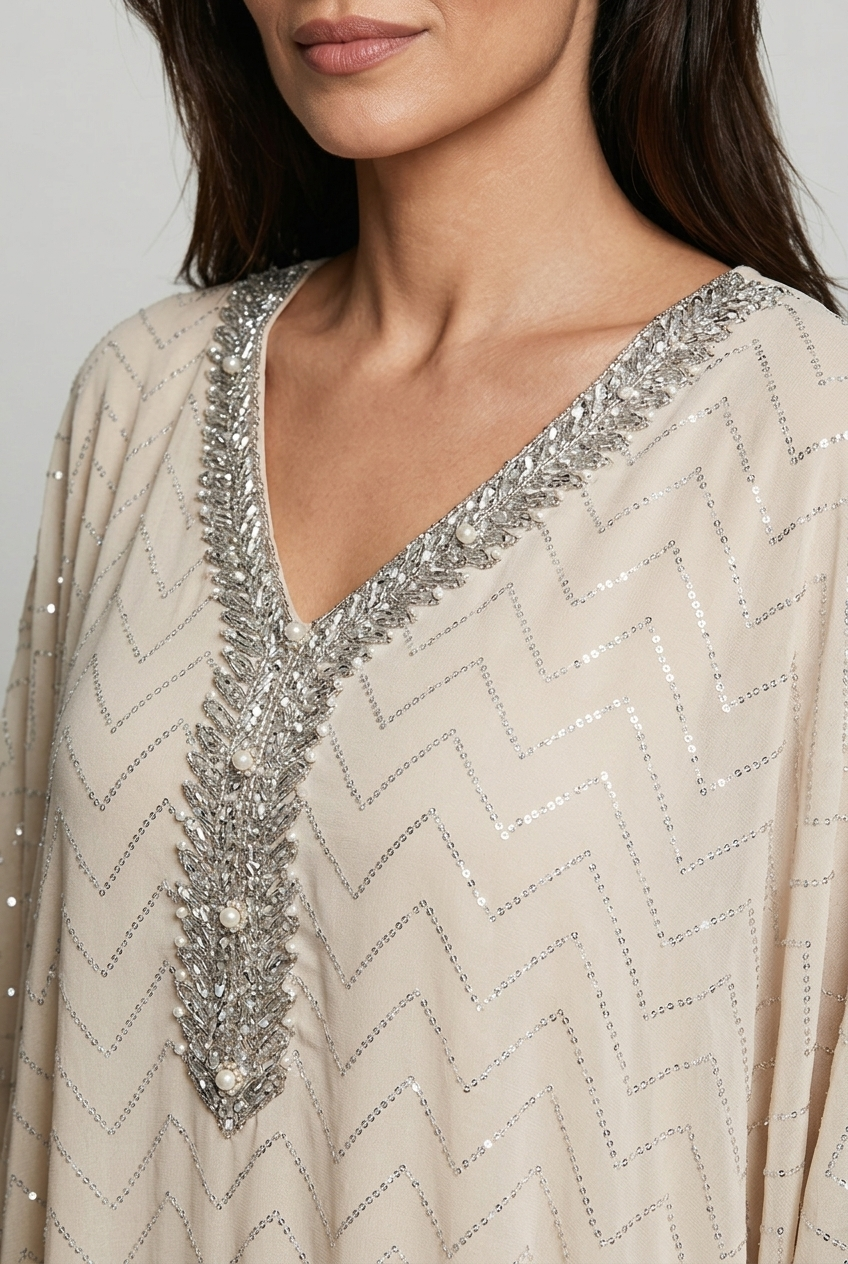 اللون البيج الهادئ لهذه الجلابية يجعلها خياراً مثالياً لكل المناسبات. تستطيعين ارتداءها في المناسبات الرسمية وغير الرسمية على حد سواء، حيث يعمل اللون على تعزيز الفخامة والبساطة في آن واحد.