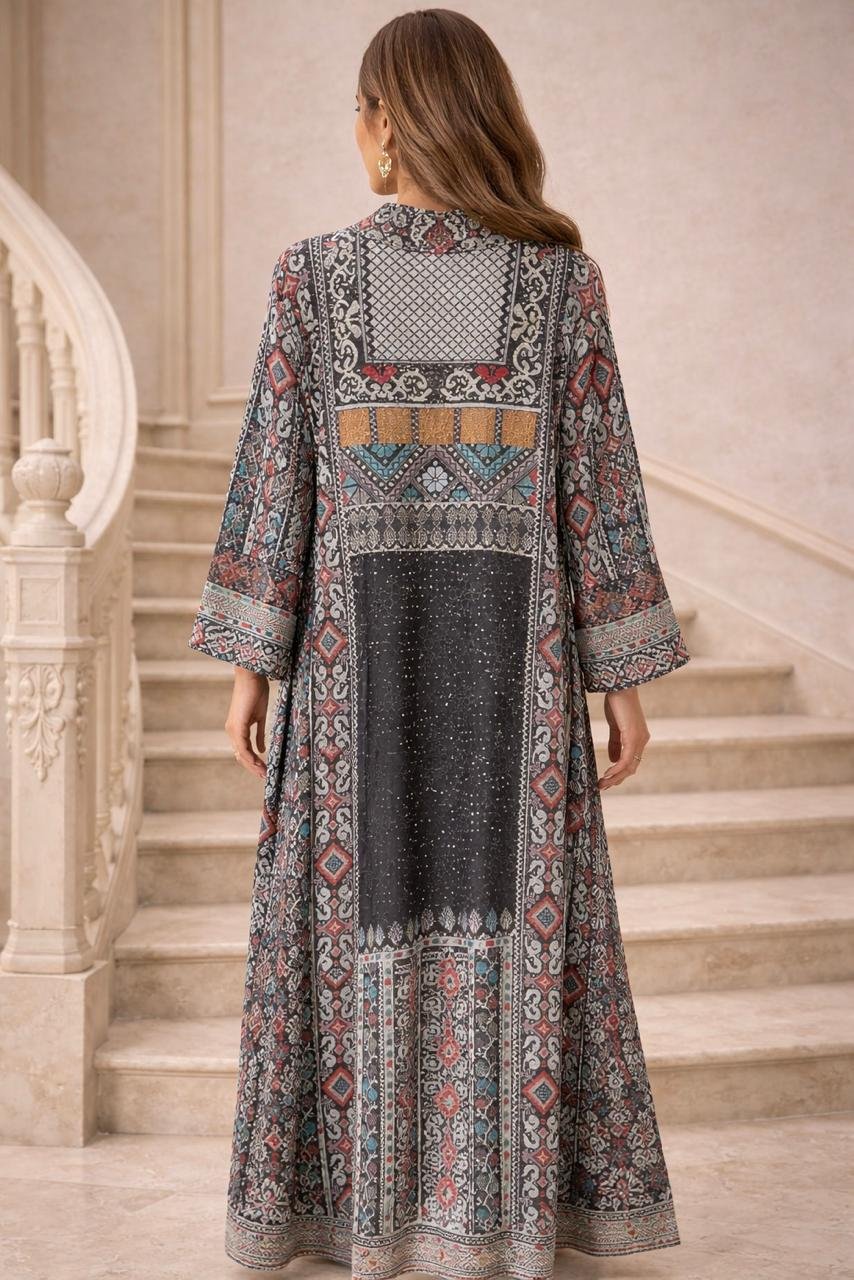 جلابيه شيفون اسود بنقوش فلكلوري وخطوط وبفصوص لامعه