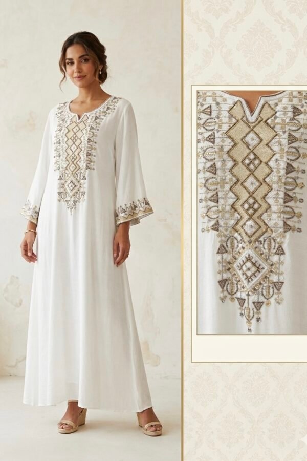 هذه الجلابية مثالية لحضور حفلات الزفاف، المناسبات الاجتماعية، أو الاحتفالات العائلية. تجمع بين البساطة والأناقة، مما يتيح لكِ الشعور بالثقة والراحة طيلة الوقت. يمكن تنسيقها مع إكسسوارات ذهبية أنيقة وأحذية متطابقة لتحصلي على إطلالة مكتملة وجذابة لا تنسى.